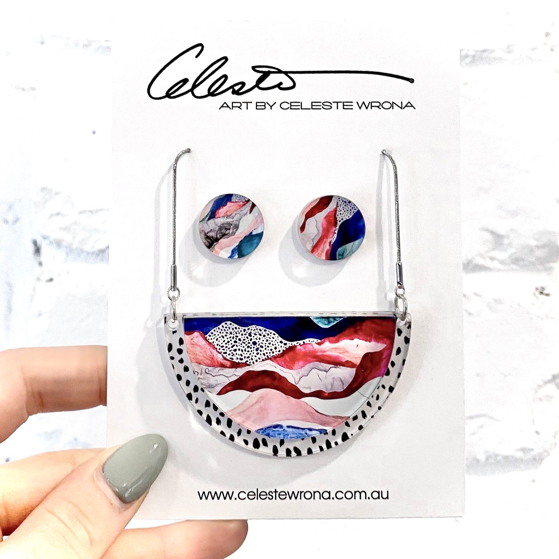 This stunningly vibrant statement necklace features sections from one of Celeste's most sought after original ink artworks. All designed by Celeste herself, printed locally and hand assembled in her studio. With a gorgeous acrylic pendant and tarnish resistant stainless steel chain, this wearable art necklace is absolute show stopper! Beautifully boxed and presented making it a perfect gift idea for yourself or someone else!