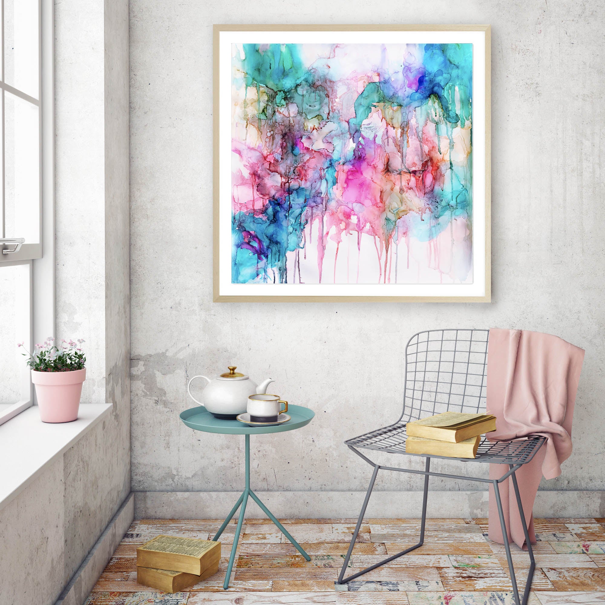 This beautiful ink painting reflects the gentle pastel colours and movement of falling spring blossoms. The artwork is framed using conservation framing methods and a lovely 20mm raw oak style wood frame. The paper has been mounted beautifully above the acid free mat to appear as though it is floating between the mat and the glass. This also allows the textures and movement of the paper to be shown.