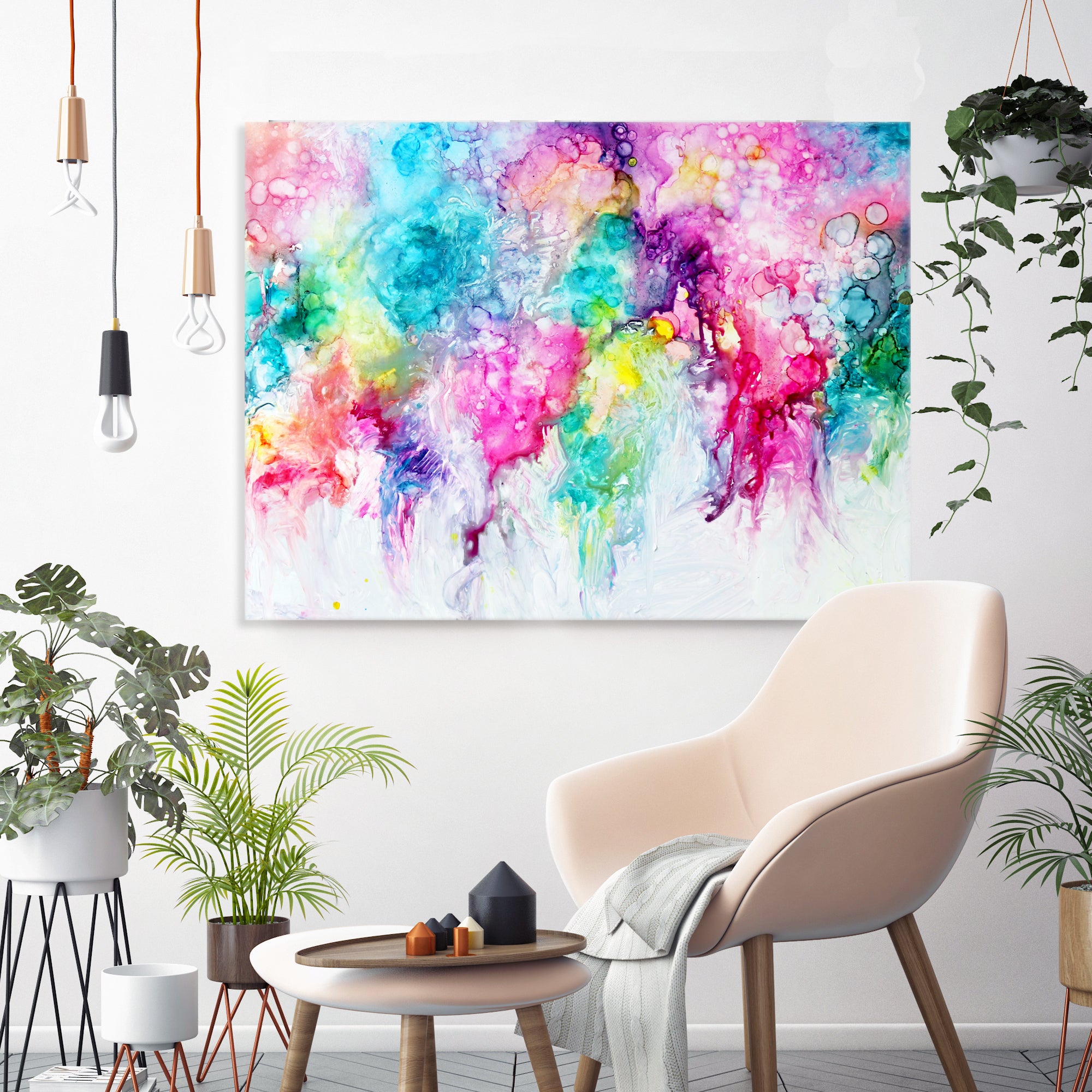 This beautifully vibrant ink painting draws inspiration from flowers dancing in the summer breeze, vivacious hues reminiscent of the illumination of rich blooms glowing in the warm morning light.
