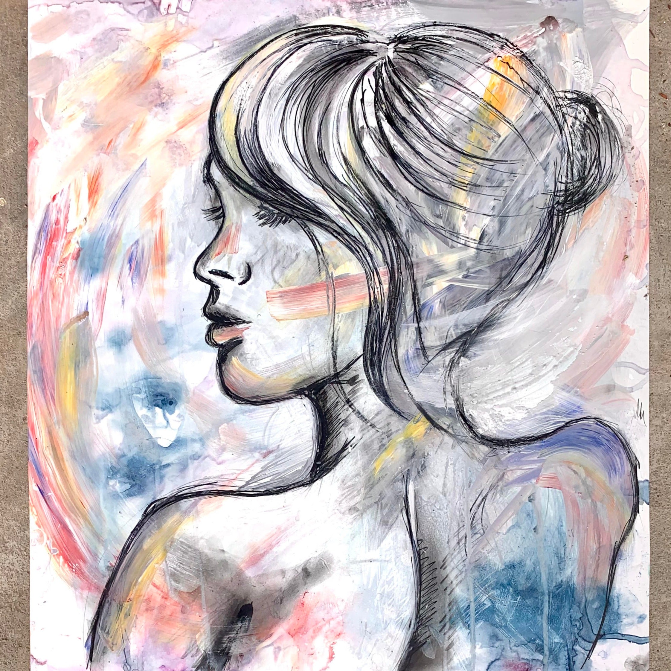 This beautiful mixed media artwork of the female form has been made with inks, acrylics, charcoal and pencil on paper. The artwork is available unframed or framed.