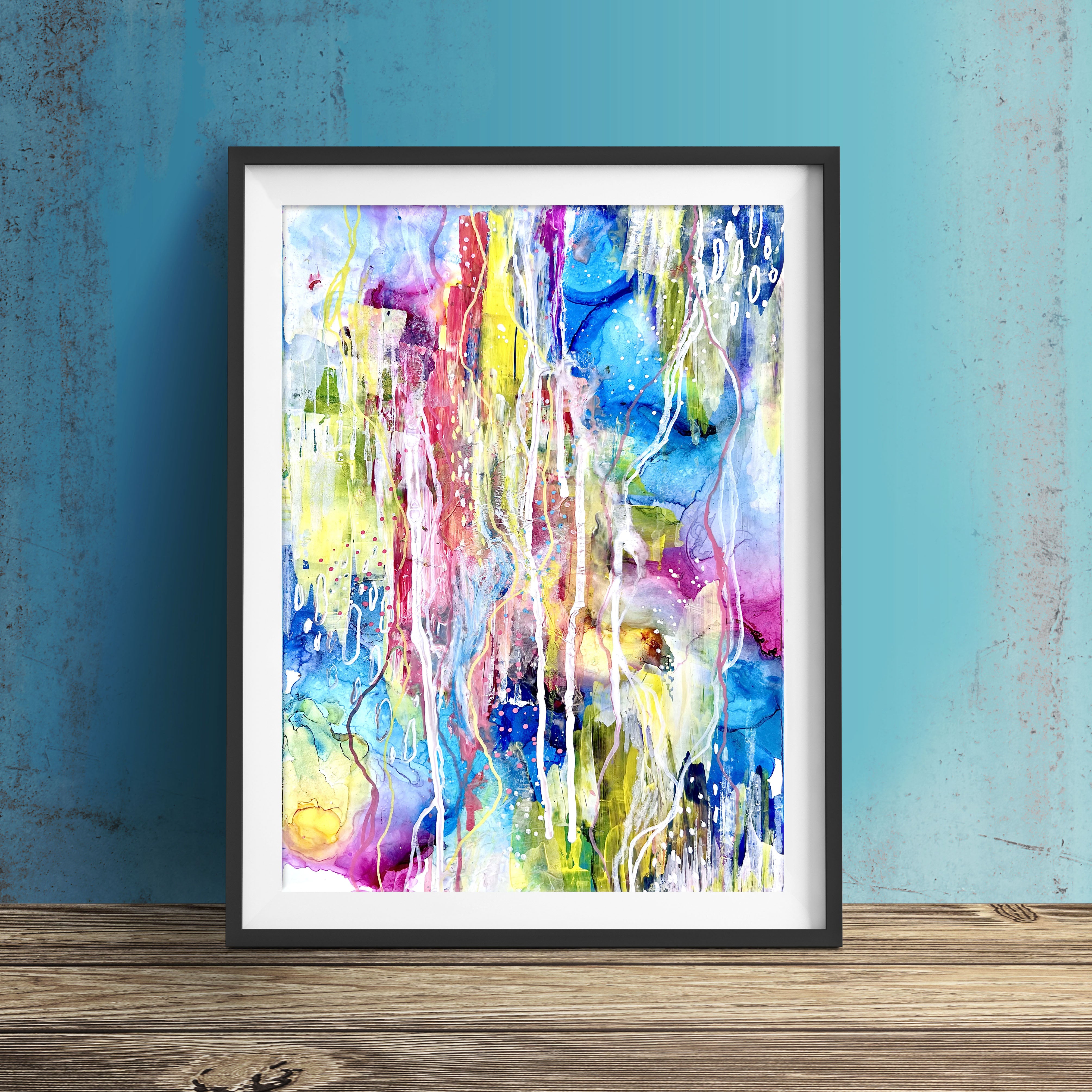 A colourful mixed media abstract painting dominating in blues, pinks and yellows with white drips falling down the page. The work is very layered, merging fluid inks and acrylics. It feels like a burst of flowers, sunshine and fragrant air on a summers day.